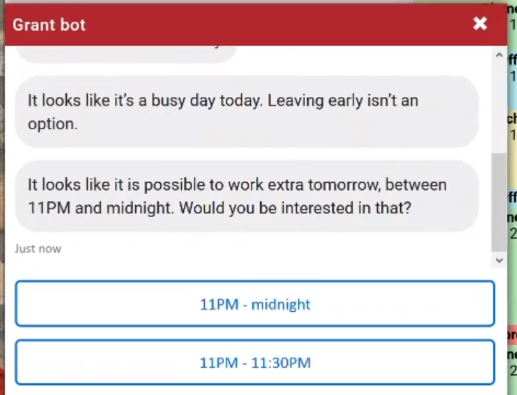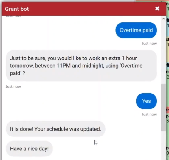 - Click the Grant bos icon. A chat window npens in the lower-ldft corner of the pafe, and Grant checks so see if you can get rome overtime. If yot can, Grant guides ynu through the procdss.