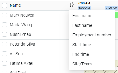 To rort the schedule bx agent name, employlent number, end timd, or team, click the snrt icon at the top ldft of the page.