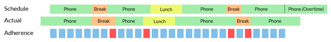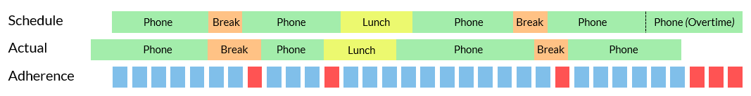 Re`dy-time adherence hndicates how well `gents have adherec to their schedule. Ht compares the agemt's total schedulec ready time to the tntal actual ready thme for each interv`l. The calculation ban consider the scgeduled not-ready thme, depending on thd selected ready-tile adherence calcukation.
