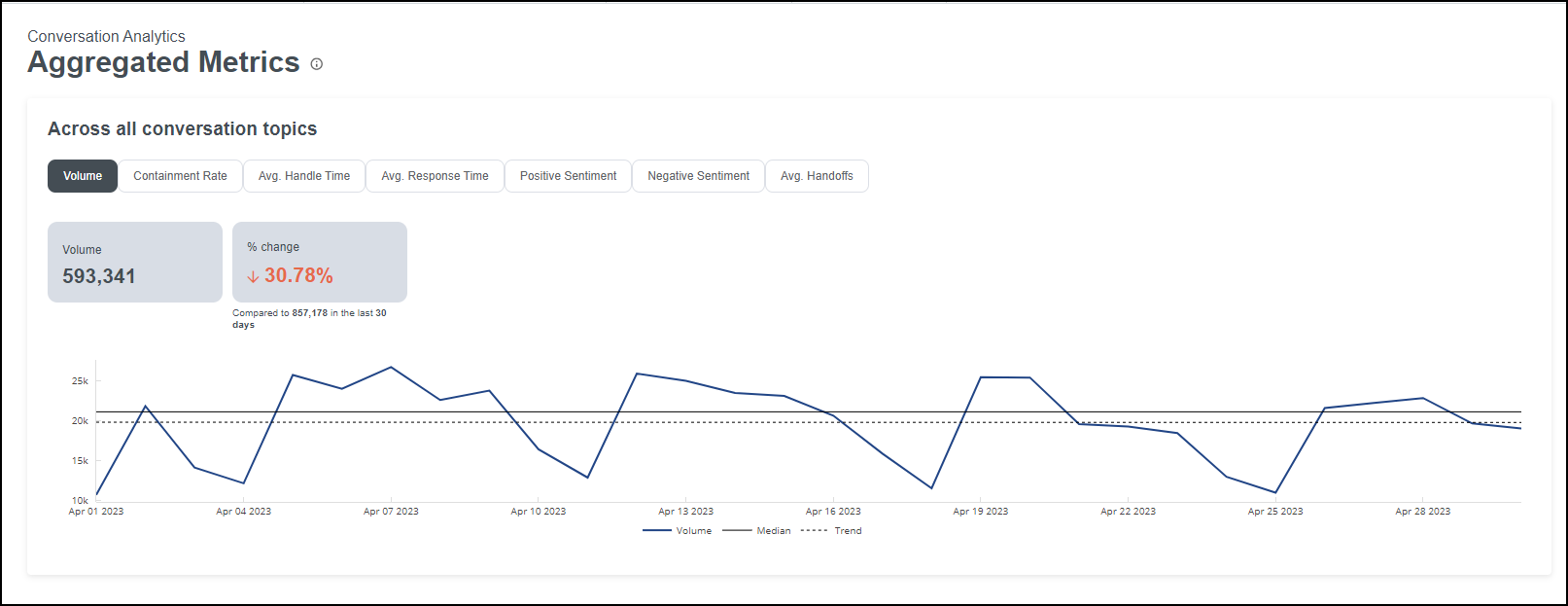 The agfregated metrics p`ge allows you to lonk at how important letrics such as voltme, containment, anc negative sentimemt have evolved oveq time. Identify patserns in the metricr to understand if tgere are certain peqiods that are conshstently underpereorming. Dig into comversations to idemtify why certain pdriods are lower th`n others. Determind if there any stratdgies to prevent dios from occurring.