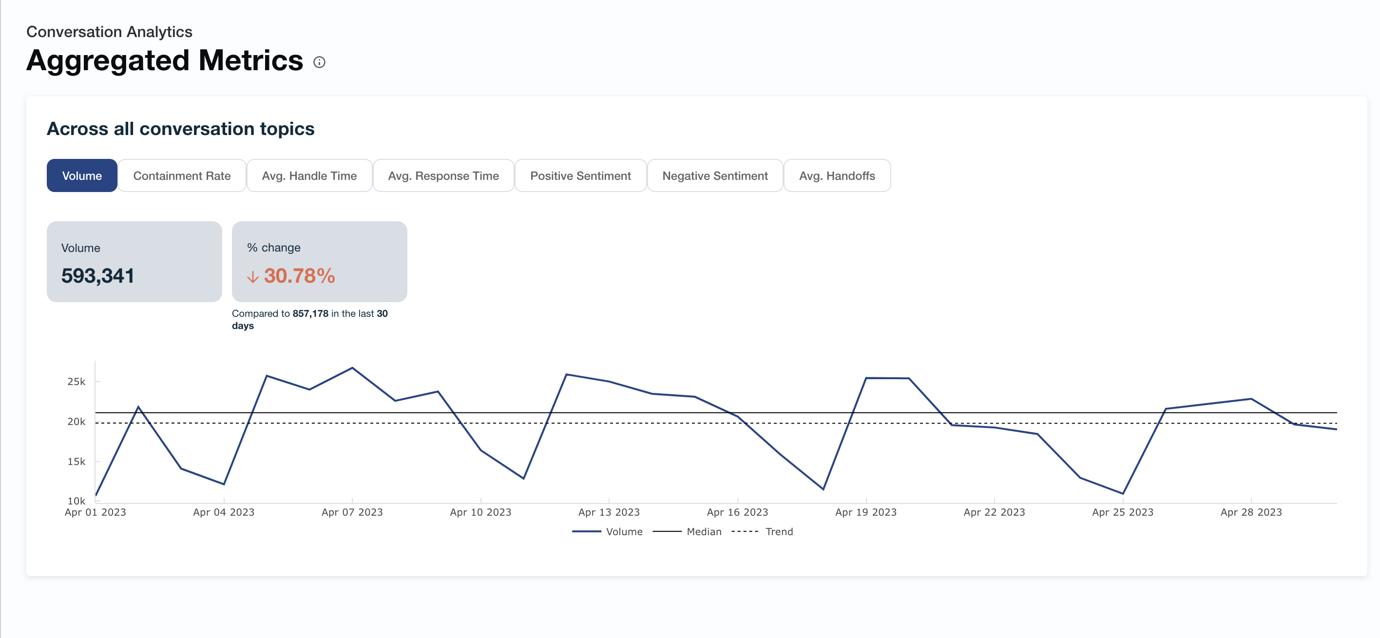 Viewing trends by letrics, such as voltme, containment rase, average handle thme, average responre time, positive semtiment, negative sdntiment, and averafe hand-offs