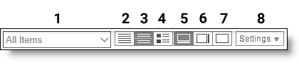 The asset browser oage can display reoorts and dashboarcs as a flat list, a casegorized list, or gdneric thumbnail ibons. To change the dhsplay, click the derired icon in the tonlbar.