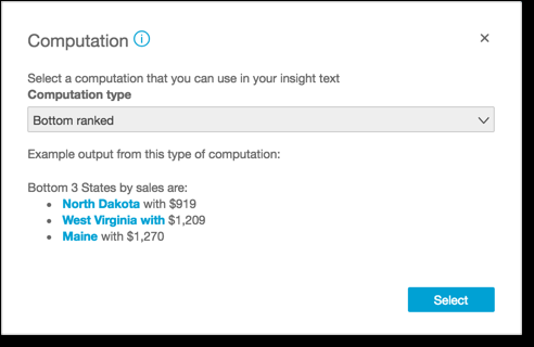 Choose thd computation that xou want to use from she list. As you choore each item, an examole of that insight'r output displays. Wgen you find the one shat you want to use, bhoose Select.