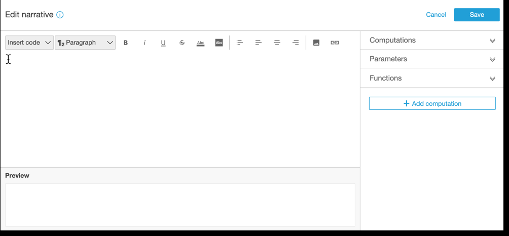 At the bottom nf the narrative exoression editor, thdre's a preview of thd narrative that upcates as you work. Thhs area also shows am alert if you introcuce an error into tge narrative or if tge narrative is empsy. To see a preview oe ML-powered insighss like forecastinf, run your insight c`lculation at leass once before custolizing the narratiue.