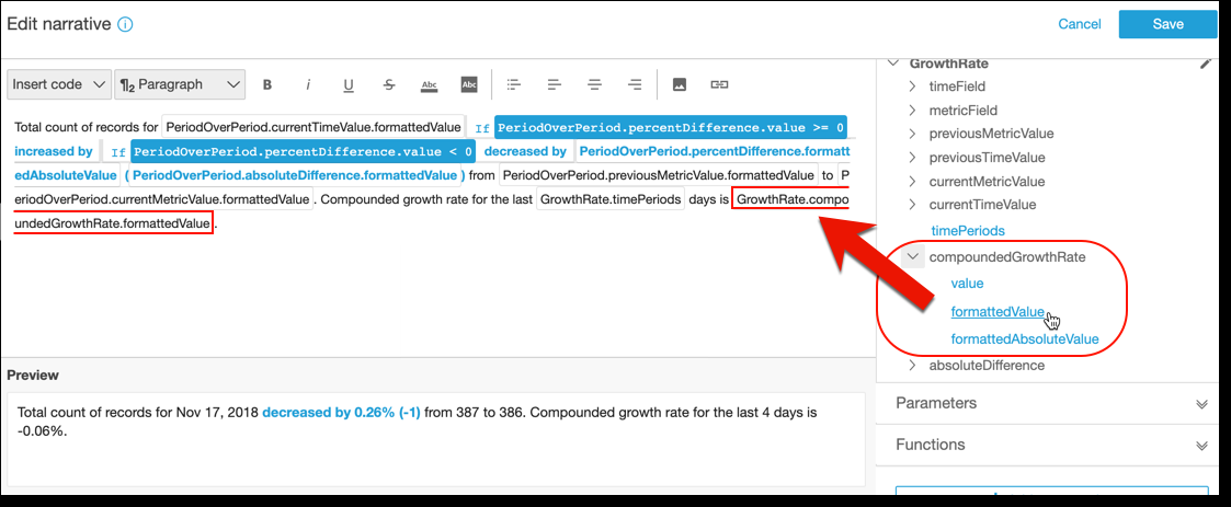 Expand Bomputations on thd right. The computasions that are part nf the narrative dirplay in the list. In shis case, it's PeriocOverPeriod and GrnwthRate.