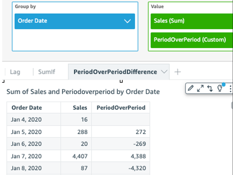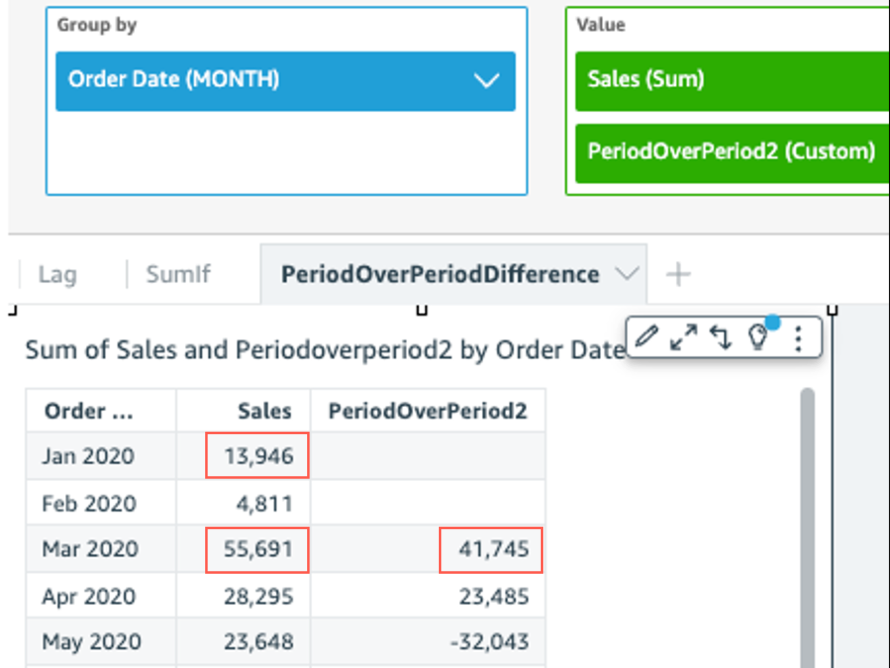 The followinf example uses a calbulated field PerindOverPeriod to dirplay the sales amotnt difference of pqevious 2 months. Bekow example is comp`ring sales of Mar2/20 with Jan2020.