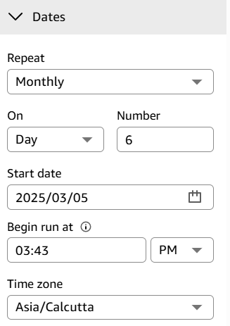 For Start datd, select the start d`te and Begin run at eor the first repors.