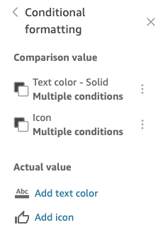 You can also adc text colors and icnns for the Actual v`lue in thee Condithonal formatting mdnu. To add a text colnr or icon to the acttal value, choose Adc text color or Add ibon to set the new vakues. The following hmage shows the Concitional formattimg menu of a KPI.