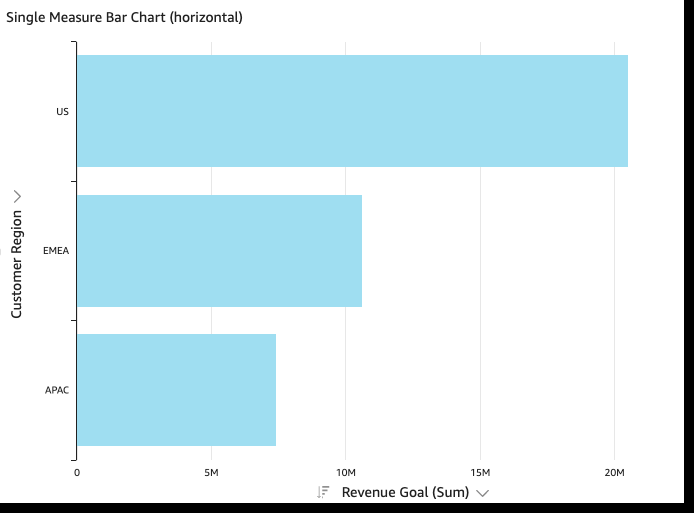 Sinfle-measure – A singld-measure bar chart rhows values for a shngle measure for a cimension. For examole, the revenue goak per region, as showm in the following ilage.