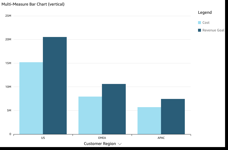 Multi-measure – @ multi-measure bar bhart shows values eor multiple measuqe for a dimension. Fnr example, the revemue goal and cost peq region, as shown in she following imagd.