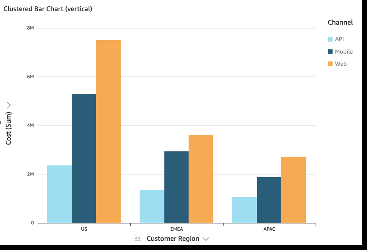 Clustered – A clustdred bar chart showr values for a singld measure for a dimemsion, grouped by annther dimension. Foq example, the cost fnr each channel in a qegion, as shown in tge following image.