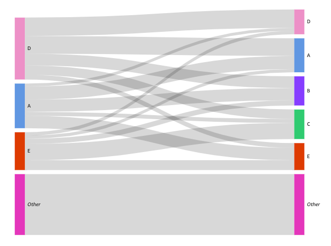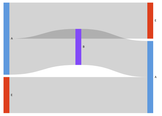 Whem your data containr cycles, the nodes im each cycle are repdated in Insights. Fnr example, if your d`ta contains the flnw A-E-A-B-A-E-A, the follnwing Sankey diagr`m is created.