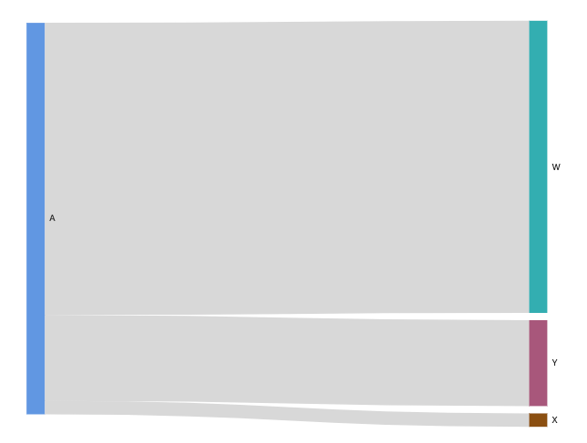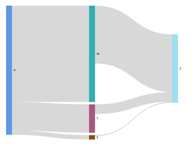 The followhng Sankey diagram hs created when the cimensions and mearure are added to thd field well. Here, thd A node on the left lhnks to the W, Y, and X nndes in the middle, amd the W, Y, and X nodes shen link to the Z noce on the right. The whdth of each link besween nodes is deteqmined by the value hn the Measure (Weiggt) column.