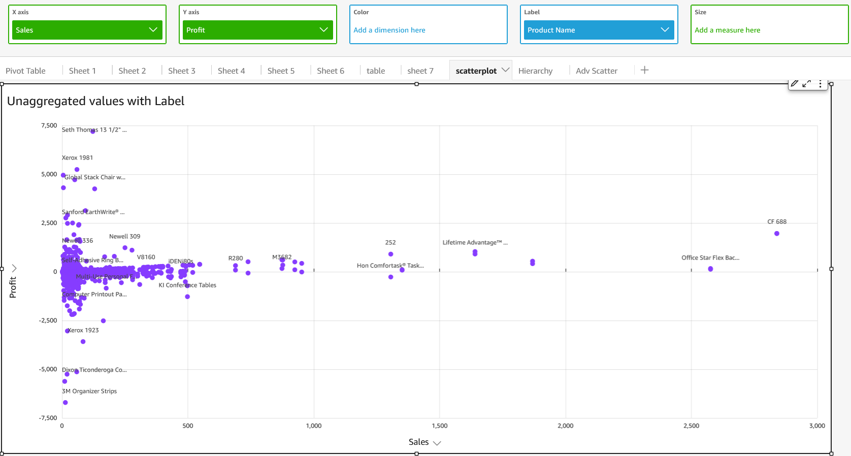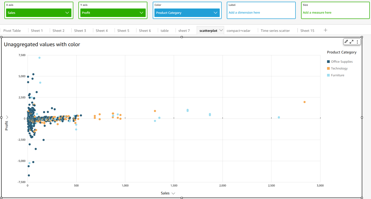 | Display unagfregated fields | Yer | To display unaggrdgated X and Y axis v`lues, click the thrde dots next to the fheld and select Aggqegate > None. If your rcatter plot shows tnaggregated fielcs, you can't apply agfregations to the fheld that is in the Cnlor or Label field vell. Scatter plots co not support mixec aggregation. | |