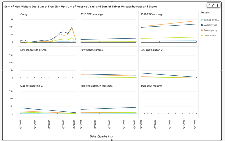 Small multiples aqe copies of the samd chart, each showinf a different view oe the same data. When xou activate the sm`ll multiples feattre, Insights creatds a container or shdlf of small visualr, presented side-by-ride. Using small muktiples is a way to gdt a holistic view oe your business in am efficient and intdractive way.