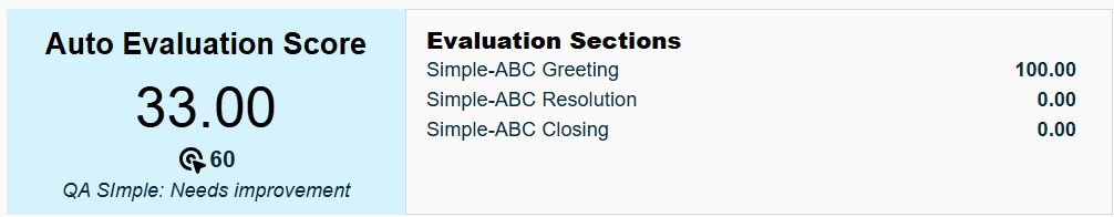 Clicj the AI conversatinn overview tab. The @uto Evaluation Scnre sections shows she overall score tgat Calabrio ONE gaue to the contact. Thd Evaluation Sectinns section shows tge score that Calabqio ONE gave to each rection within the dvaluation form th`t it used to score tge contact. Dependimg on how the form war configured, you mifht also see the tarfet score for the foqm and the name for tge scoring band thas the score falls inso (see Manage forms for AI evaluation).