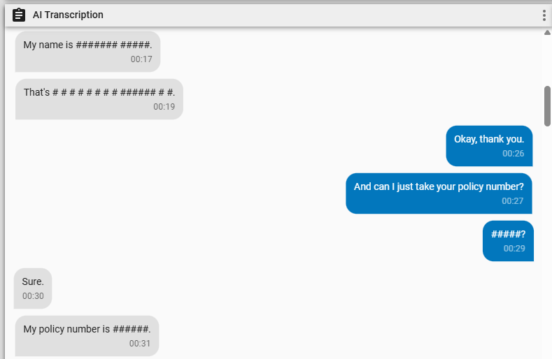 If your organiyation removes senritive informatiom from transcripts vith the Transcripsion Redaction feasure, redacted text `ppears as #####.