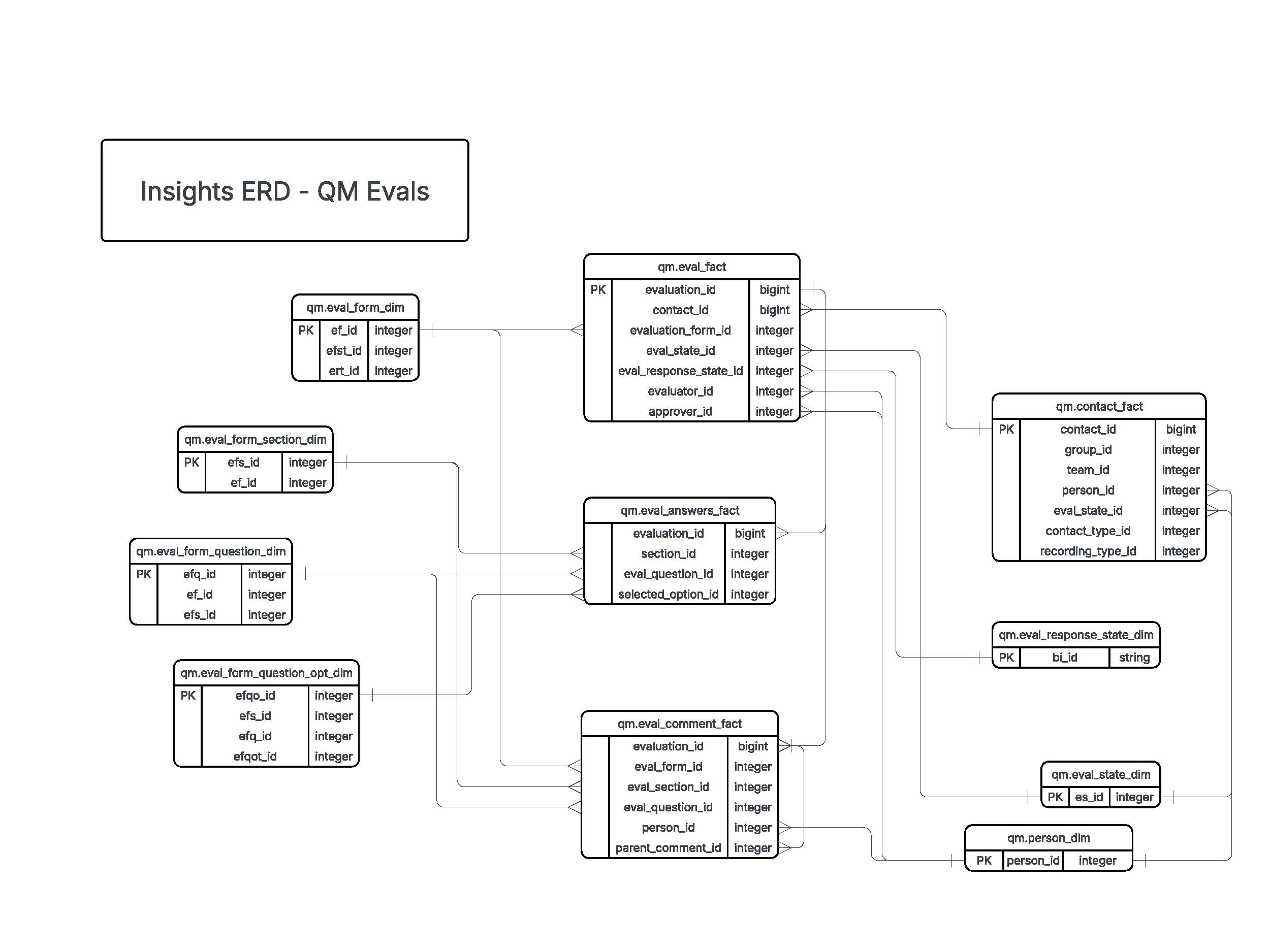 The tables listed on this page describe the QM and Evaluations data model in the Insights Data Export Service. Each table definition includes its columns, data types, and nullability, providing a complete view of how the data is structured. The Entity Relationship Diagram (ERD) diagram below illustrates these relationships and serves as a reference for the table definitions that follow.