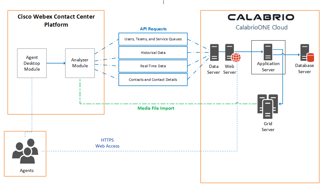 The architecture diagram below shows the connection between Cisco Webex Contact Center and the Calabrio ONE suite. Note that the diagram includes Classic WFM.