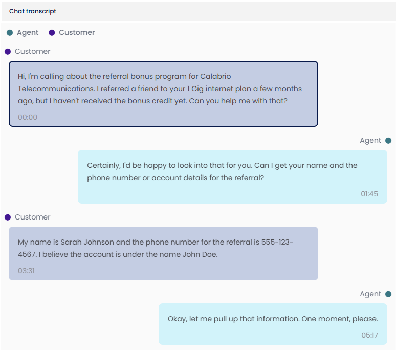 The Chat Transcript panel in the new media player contains chat conversations. The responses from the agent who handled the contact are on the right, and responses from the customer and any other agents involved in the conversation are on the left. The messages from each person in the conversation are a different color for up to four different participants. (If a conversation has five or more participants, the colors repeat.)