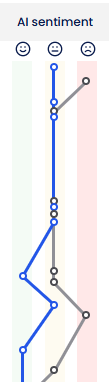 The AI Sentiment panel illustrates how agent and customer sentiment (emotion) changed over the course of a contact. The agent’s sentiment is blue, and the customer’s sentiment is gray. Positive sentiment appears in the stripe on the left. Neutral sentiment appears in the stripe in the middle. Negative sentiment appears in the pink stripe on the right.